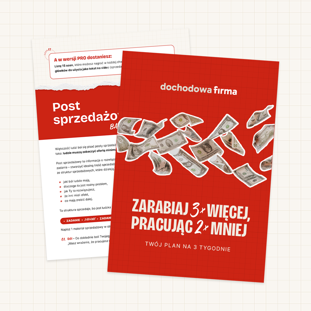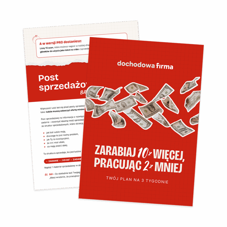 - struktury, które przynoszą pieniądze od pierwszych dni (follow-upy, DM, social proof, lead magnet, koszyk, plan przychodu, standardy, delegowanie)